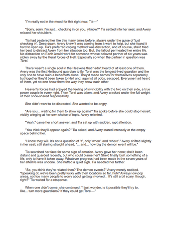 Guardians Avery and Torei shared the spotlight as the best of the best among the Heavens' ranks– then Torei disappeared. A month later, they turned up wearing the colors of the enemy, surrounded by an army of demons. Now, Avery struggles to manage the responsibilities she once shared with her partner alone, fighting to keep the peace in the Heavens as they work to figure out what went wrong. Meanwhile, she meets with Torei in secret, desperately attempting to bring them back– if she even can.