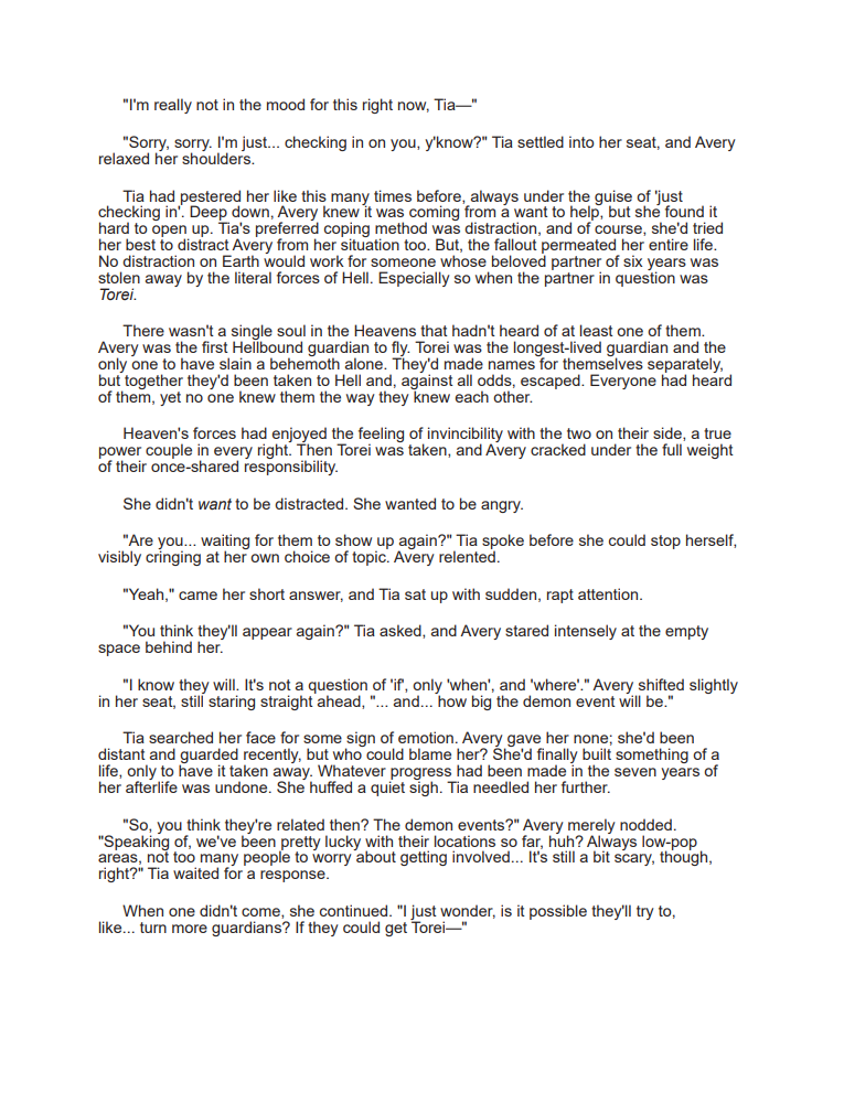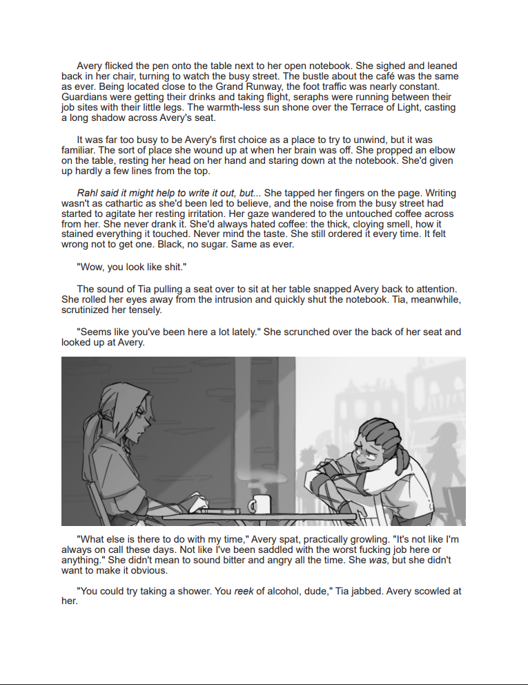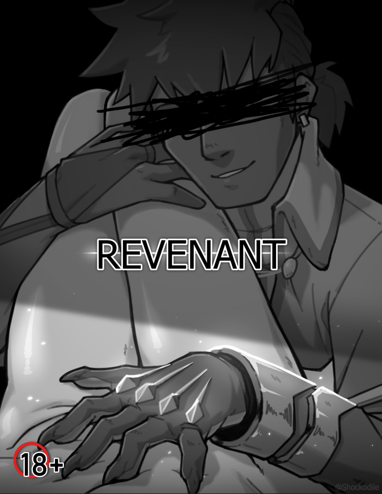 Revenant is a romantic tragedy where things that were perfectly right go horribly wrong. Set seven years after the events of Hellbound Guardian, it follows the characters becoming the worst versions of themselves despite their original happily ever after. Revenant contains both descriptions and depictions of violence, alcoholism, suicidal imagery, strong language, and explicit sexual content (NB/F). It is intended for mature audiences.